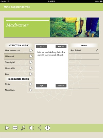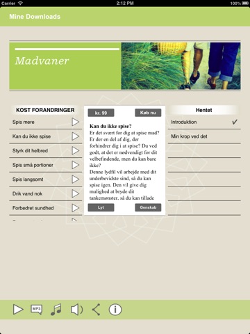Der medfølger en gratis hypnose "min krop ved det" når du downloader appen. Du kan senere tilkøbe andre selvhypnoser direkte fra programmet. Priserne for disse er 99 kr.