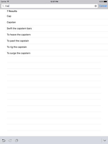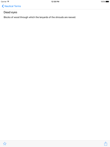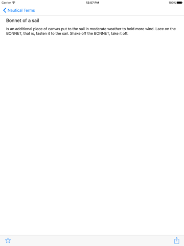 Nearly useless as a reference because so many terms and definitions are obsolete and have little relevance to modern usage. For example, the term "spars" is defined in this app as "pieces of trees as they are cut in the wood." That definition might help a 19th century sailor, but in the 21st century, spars are the mast and boom of a sailboat and are more likely to be made of aluminum.