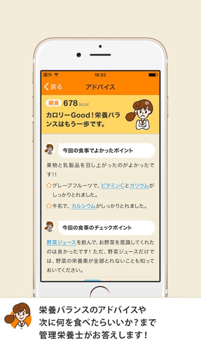 カロリー計算だけでなくアドバイスが届くので、食事の記録が楽しくなります。