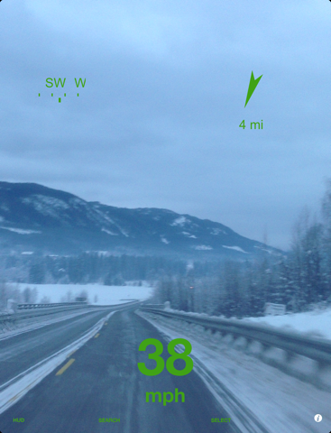 It displays speed and compass direction, and points towards your destination if one is selected. The tool supports both camera mode showing the information directly on screen, and HUD mode for projection onto a car windscreen.