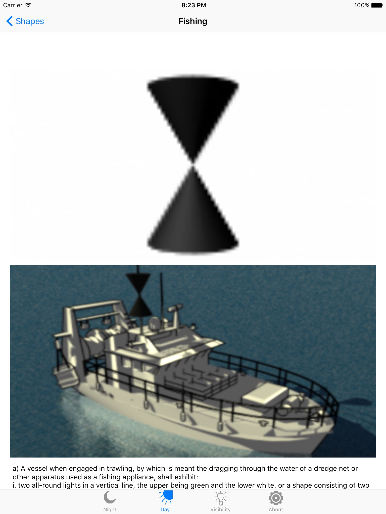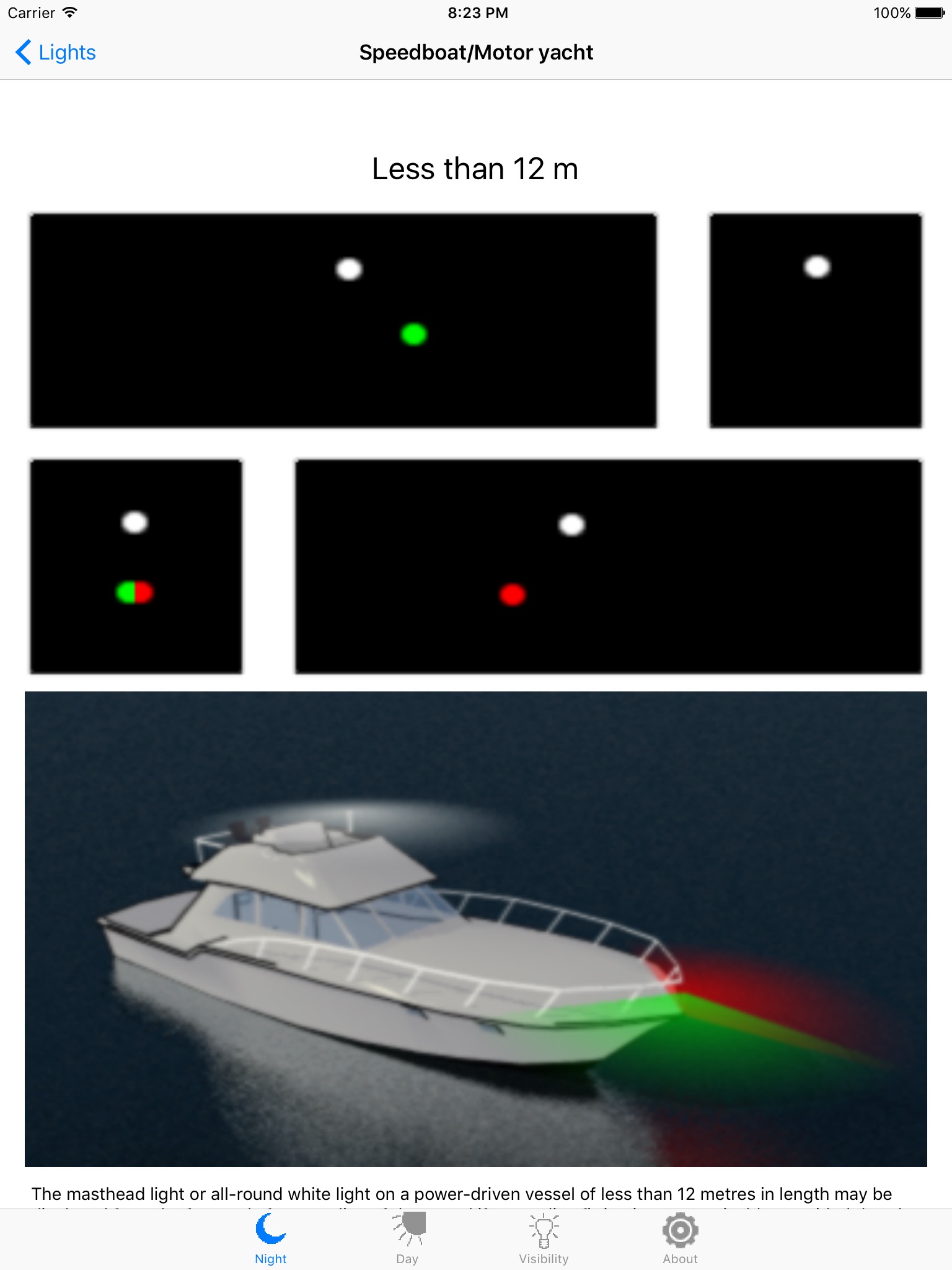 If you see a light combination at sea at night, you can find it in the "Night" table and click it to see a 3D view of a ship displaying the lights and a description of the rule.