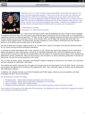 The latest information and resources for US Navy Individual Augmentee (IA) sailors, families, commands, and civilian employers. Covers the entire IA Process, from NMPS and INCONUS training to Boots on Ground to returning home. Includes videos of returning IAs explaining their experiences and a variety of Navy publications on the subject, including the relevant Instructions and NAVADMINS. An extensive collection of links to IA related information on the internet is also included. The videos and publications embedded in the app can be viewed without an internet connection, allowing sailors to have this information available during deployment, whether at sea or Boots on Ground.