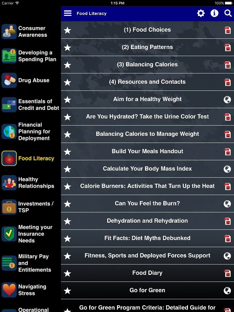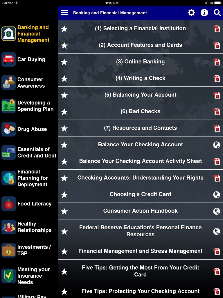 Military Pay and Entitlements, Banking and Financial Management Services, Developing a Personal Spending Plan, Essentials of Credit and Debt, Investments and Savings, Financial Planning for Deployment and Government Travel, and General Consumer Awareness.