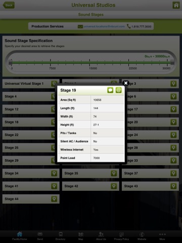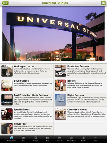 NBCU Studio mobile application is an interactive production tool for film makers. It provides all the necessary information about the 3 facilities at Universal Studios, Chicago and New York at the users finger tip. Critical Information is offered about the various stage specifications, lots, maps, navigation to the stages, photos and much more to assist the film makers in completing their projects.