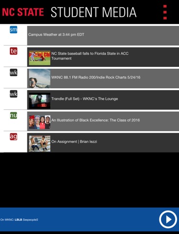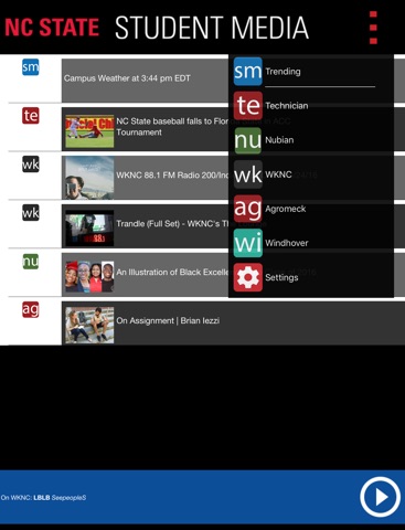 NC State Student Media is the official app for the Student Media department at North Carolina State University. The app features the daily student newspaper, Technician, the 24/7 radio station, WKNC 88.1 FM, the weekly African-American newspaper, NubIan Message, the yearbook, Agromeck, and the annual literary magazine, Windhover. The app is sectioned into each media outlet to give you quick access to the content you want, whether it is reading the local news or listening to the radio.