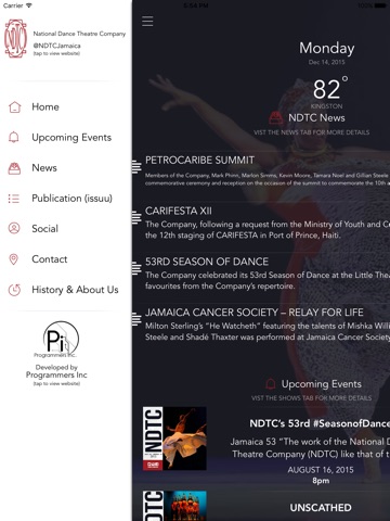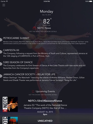 The app design takes into consideration the NDTC user base and uses minimum, but fluid animations. The use of translucency and background images with performances gives the app an artistic touch and a peek into the NDTC. The navigation menu is accessed by a simple tap of a button or a swipe to the right and makes the app very easy to use.