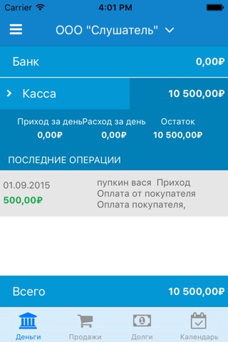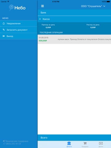 - Возможность увидеть последние операции по выбранному подразделу (Банк, Касса, Банк+Касса) с указанием даты операции, суммы, контрагента, направления движения (приход/расход), вида операции, статьи движения денежных средств.