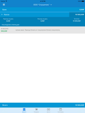 - Отображение остатков денежных средств по состоянию на сегодняшнее число: Банк, Касса, Всего.