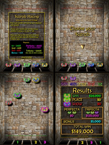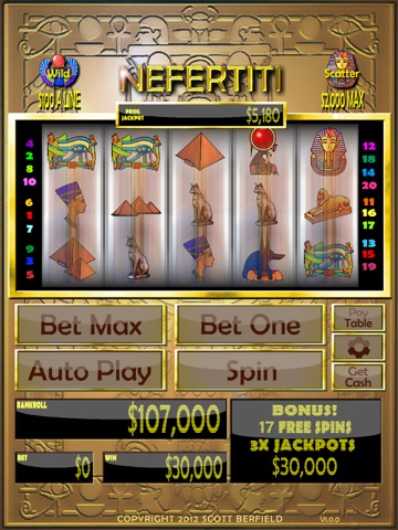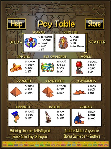 Egyptian themed 20-line slots. Bet $100, $1,000, or even $10,000 per line. Win free spins on scatters at 3X payout. Play the Scarab Race bonus game for big payouts. Earn more cash every day with the daily spin. Visit the in app store to pick up extra cash!