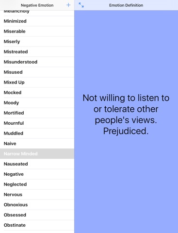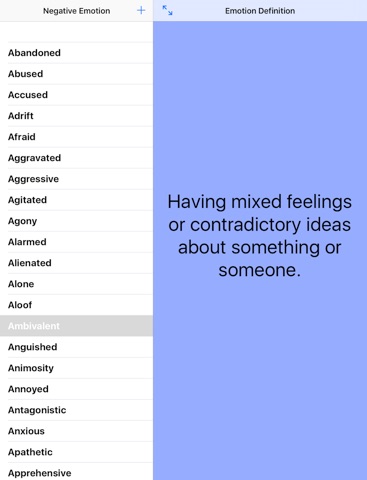 This app is great for teaching kids also, whether at home or in a school setting. Together we can raise a more emotionally intelligent generation. Identify when you or your children feel alienated, burdened, or clumsy, and talk together about it. Get this app together with the Positive Emotions List app for best results.