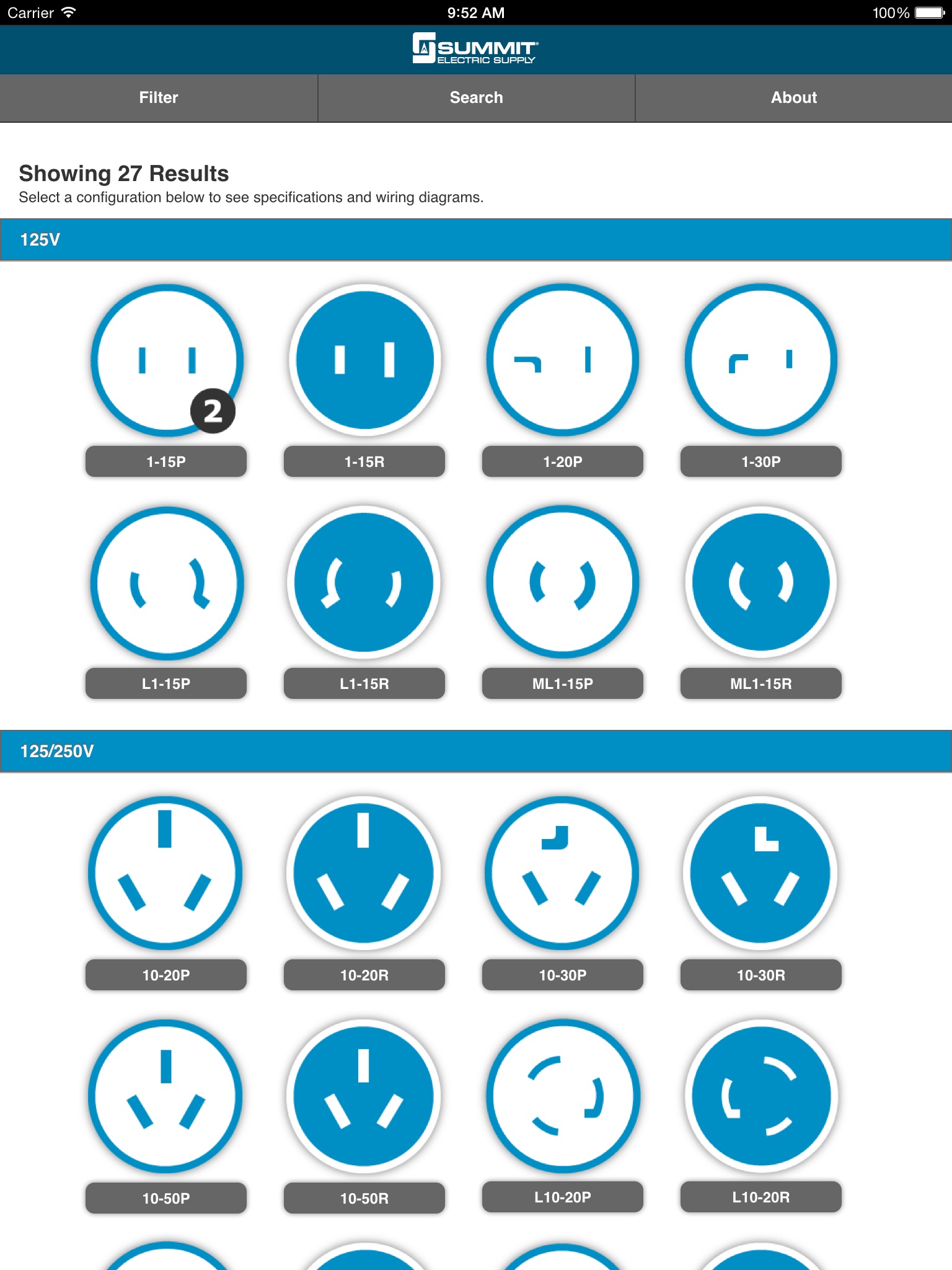 Summit Electric Supply’s NEMA Configuration Guide puts over 240 NEMA configurations at your fingertips. This app helps you quickly and easily identify your device so you can move on with your project. Search by NEMA configuration number or enter known information such as voltage, amperage or poles to filter for matches. Tap on an icon and view detailed specifications. Use the handy plug/receptacles cross reference option to quickly find matching configurations.