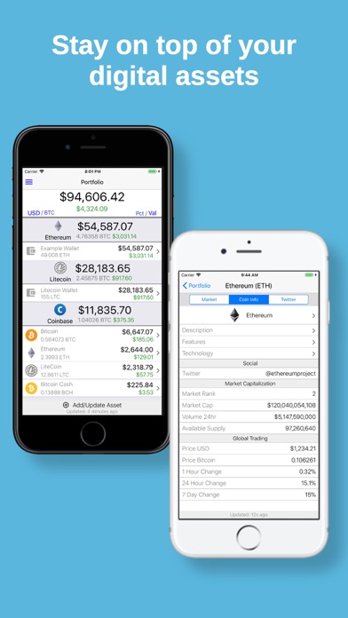 - Portfolio Valuation: View real time valuations for all your cryptocurrency investments at once wherever they are stored (hardware wallets, multi-coin wallet or cryptocurrency exchanges)