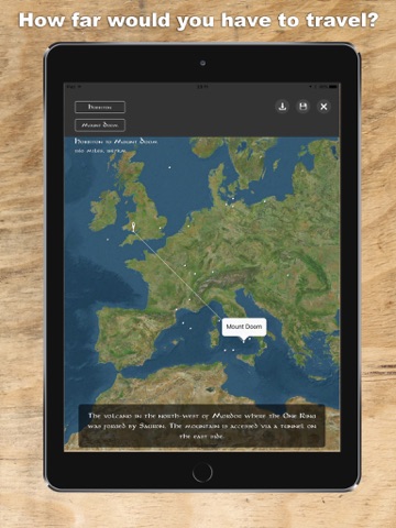 120 locations from Tolkien’s world from the First to Third Ages. You can choose to be in one of several locations and see the rest of Middle Earth relative to you. Also works with map mode.