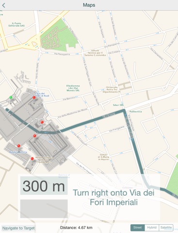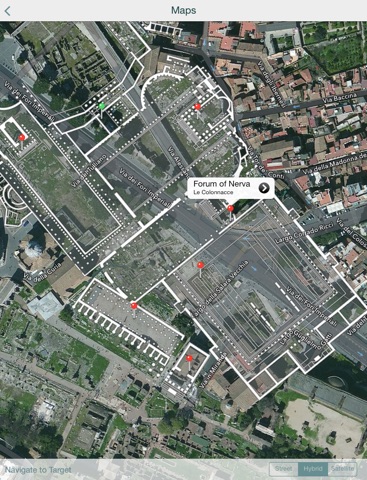 Nervar allows you to localize yourself with respect to the Roman Imperial Fora. The Area of the Imperial Fora is highlighted on the Map and you can use the Augmented Reality to see where a specific imperial forum is.