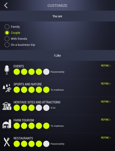 Personalize the content according to your tastes and interests by establishing your preferences visits, see the order of the thematics be adapted to showcase what you enjoy, mark the places not to be missed and those already visited or let abandon yourself to the immersive experience of an interactive tour!