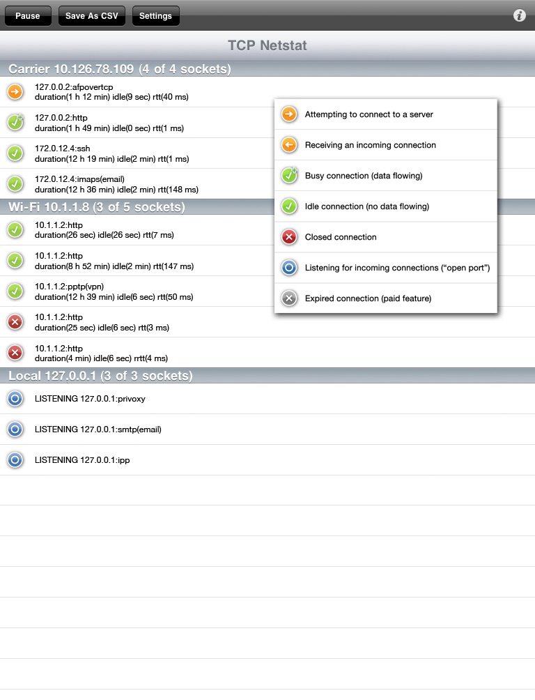 A network status app for Apple iOS — discover which servers and ports are being used on iPhone®, iPad® and iPod touch®. Monitor your device’s TCP connections for uploads and downloads (IPv4 only) and export the list as CSV. Very useful for programmers, developers and curious users! You can use Netstat’s in-app feedback if you have questions or ideas.