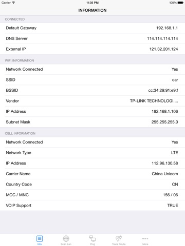 • Wifi network information such as SSID, BSSID, IP address, and subnet mask
