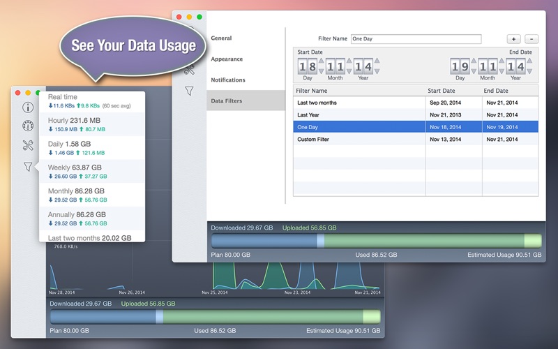 If you have a traffic cap on your Internet usage, NetUse will help make sure you don’t exceed your limits. Set your billing date and a monthly traffic allowance and NetUse will accurately show how much bandwidth you consume.