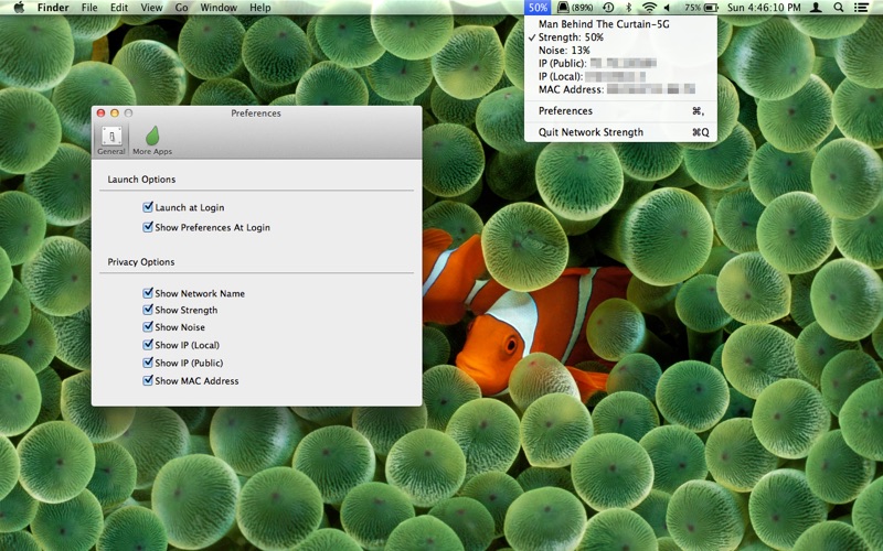 Quickly and easily check your wifi network strength in your menu bar. You can also quickly view your network name, your public IP address, your local IP address, and your MAC adress from the menu bar.