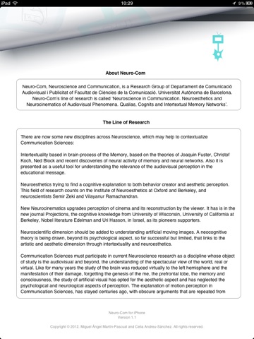 In this app, you can find information about the researchers, some articles recently published by the group, a rss about neurosciences and communication, geolocation of Neuro-Com and UAB and much more very soon...