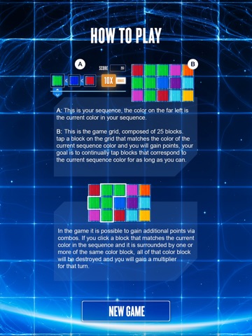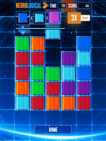 Neurological is a brain game that will test your speed and hand-eye coordination. The goal of the game is to successfully tap the correct color block given to you from a sequence for a long as you can, gaining points along the way. At the start of the game, you are given three colors, which represent the first three colors of the sequence, and you need to find a block on the game grid that matches the current sequence color. For each successful block tapped, the sequence will move up and you will continually be given a new color until you either run out of time or tap the wrong color.