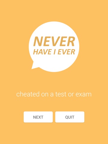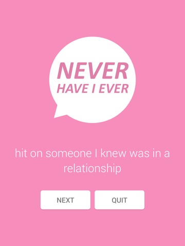 This is a great game for people who want to play Never Have I Ever but cant think of anything to say. There are a lot of questions, and the questions are good ones. I love that the app splits the questions into categories, and that you can also do random questions from all the categories at once. The game is very simple and easy to use. The design is very clean and simple, which I like. It doesnt make things more complicated or difficult to use than it needs to be. There are ads in the free version, obviously, but a normal amount for a free game. Its only $0.99 to update to no ads, which is very reasonable. I would definitely recommend this game to any group of friends looking to play a fun group game!