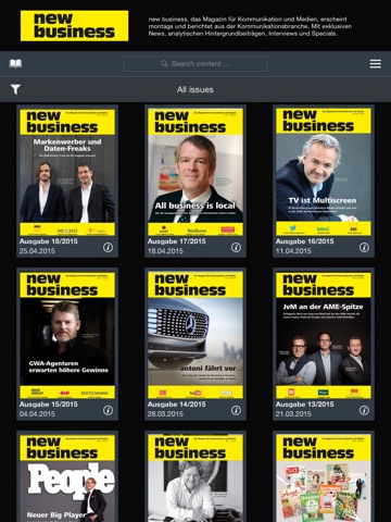 new business verknüpft die Werbewirtschaft mit der Medienwelt. Klassische und neue Medien werden mit ihren Formaten, Reichweiten und Publikumserfolgen porträtiert. Themenspecials bieten den Lesern Hintergründe, Expertenmeinungen, Fallbeispiele und Marktanalysen – für fundierte Entscheidungen in Werbestrategie und Mediaplanung!