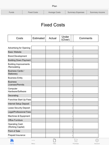 - Provides you with a Fixed and an Average Monthly Costs’ list. It is pre-populated with expense categories common to a variety of startups , and can be very useful in helping you identify all of your start up costs, including many you may not have considered. You may also add more categories pertaining to your business.