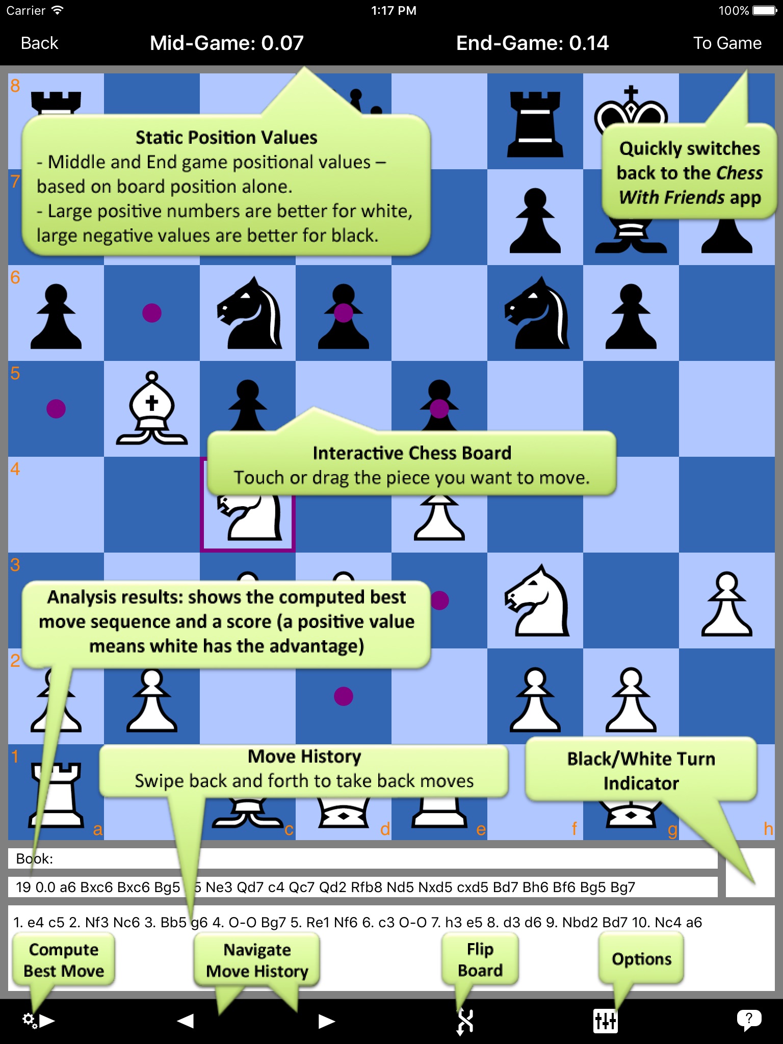 - The app can calculate the best move for you or your opponent at any time