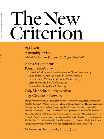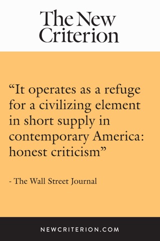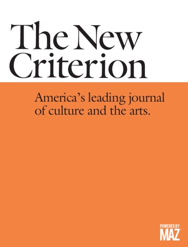 The leading review of the arts and intellectual life. Download for a FREE sample issue. The New Criterion is a monthly review of culture and the arts edited by Roger Kimball. Founded in 1982 by the art critic Hilton Kramer and the pianist and music critic Samuel Lipman, The New Criterion began as an experiment in critical audacity, a publication devoted to engaging, in Matthew Arnolds famous phrase, with "the best that has been thought and said." Harry Mount in the Daily Telegraph of London has called The New Criterion "Americas leading review of the arts and intellectual life" Julian Symons, in the Times Literary Supplement, writes that "As a critical periodical, The New Criterion is probably more consistently worth reading than any other magazine in English." Published monthly from September through June, The New Criterion brings together a wide range of young and established critics whose common aim is to bring you the most incisive criticism being written today. The New Criterion Pricing: Single Issues - $4.99 12 Month Subscription - $48 Please note: App subscriptions do not include access to subscription-only content on newcriterion.com