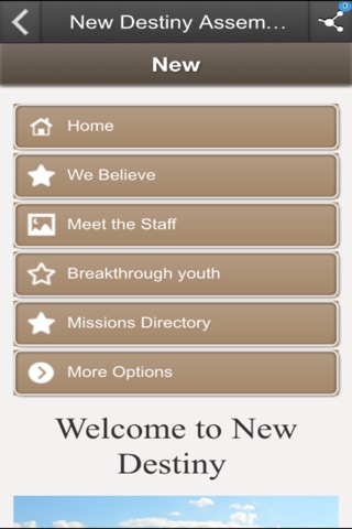 Welcome to the New Destiny Assembly of God App. Here you will find helpful links for your participation in worship with us. Please enjoy the online sermons, notes, website, and information.