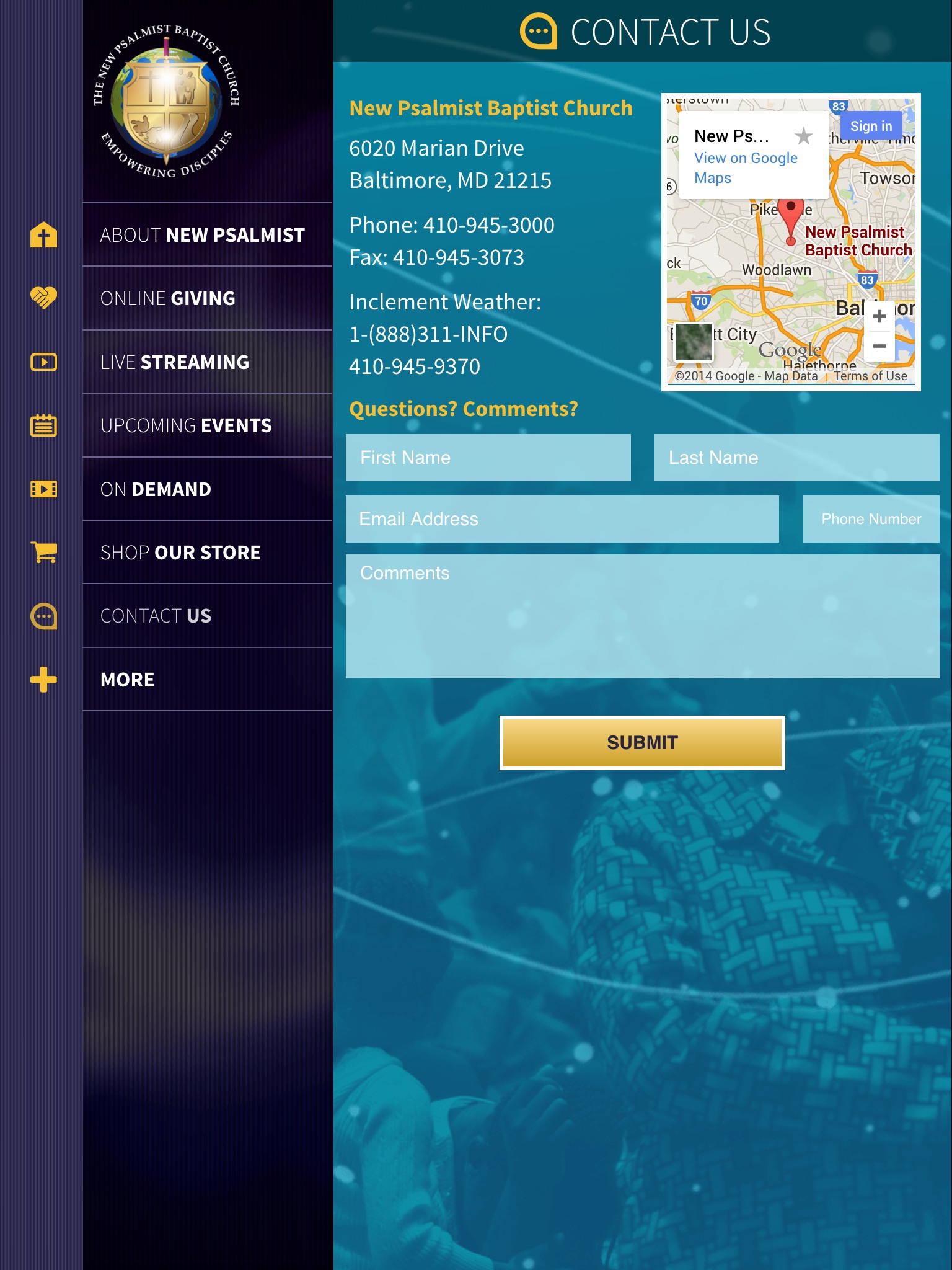 Dont wait another moment to get the nourishment you need for your day! The New Psalmist Baptist Church app will give you access to ministry information and events as well as special video content viewable 24/7/365...right from your iphone, ipod or ipad. New Psalmist also invites you to join us LIVE from the app for our worship services every Sunday and at other scheduled times.