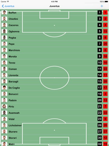 Add every player with his image, name, number and position; positions from 1 to 11 are the starting lineup; positions above 11 are reserves.