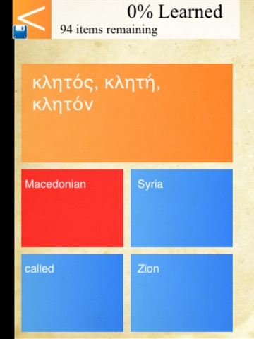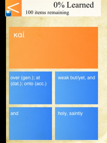 NOTE: The app assumes the ability to read the Greek alphabet, at least on a basic level. The app does not currently cover any grammar, as it is designed explicitly for building vocabulary, but a separate app covering grammar is in the works.