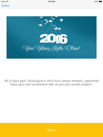 En geniş veritabanına sahip, en son ve en yeni mesajlardan istediğinizi seçerek kolay arayüzü ile ister mesaj (SMS) ile isterseniz Facebook mesajı olarak, isterseniz Twitter da tweet atarak, isterseniz mail olarak kutlama yapabilirsiniz.