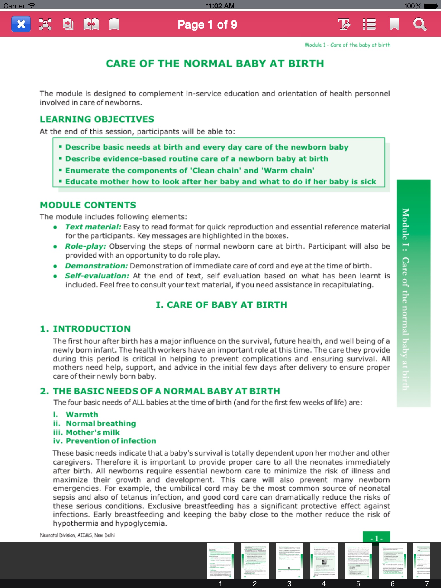 The NewbornCare app is based on the "Essential Newborn Nursing for Small Hospitals " Training Tool of WHO Collaborating Center for Training and Research in Newborn Care, All India Institute of Medical Sciences, New Delhi. This is conceptualized on evidence based practices advocated by WHO HQ , Saving Newborn Lives ,National Neonatology Forum , Kangaroo Foundation, and experts opinion . The app contains menu-based information for managing normal, at risk and sick newborn. Links to newborn procedures and equipment videos, wall charts in easy to read format are provided. This is complimentary to SickNewborn app of WHO CC AIIMS .