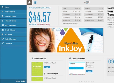 The Newell Brands Investor Relations app provides access to the latest company news and events, financial information and investor presentations in an easy-to-read magazine layout. Features include: - Latest news releases and presentations - Offline document center including quarterly and annual financial reports and SEC filings - Stock quote and interactive stock chart.
