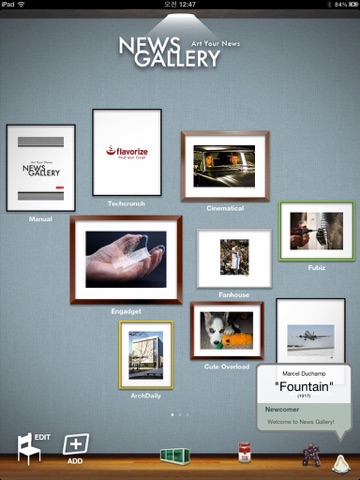 Take a promenade in modern News Gallery of news. News Gallery is a fast, easy, and artistic way to view the news you have subscribed in frames. Build the museum of your tastes. Become a curator of your own news gallery. Your news and artsy wants converge into the New Gallery. Share the exhibits of your taste with your friends on facebook, twitter, Instapaer, Read it Later, and Evernote.