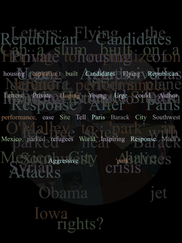 News Wheel is an app that explores the poetics of ever changing news headlines. It begins as a spinning disk divided into nine sections each representing a different news source. This playful interface invites users to start and stop the wheel eventually filling the screen with a collage of current headlines. Individual words can be deleted and repositioned so users can create their own poems from this content. In addition, dragging ones finger across the screen creates an animated chain of text derived from todays headline news.