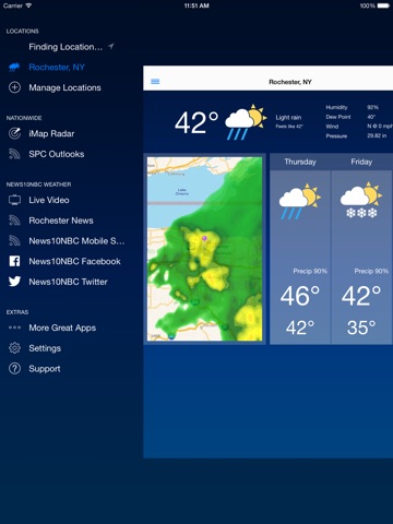 Update: I guess I spoke too soon about adding certain areas to the radar map, in the futurecast section does give you the option to choose the areas closer to you, i guess I didnt play around with it as much to notice till now. Very cool, a bigger plus to the over all experience to this app! Ive had my iPhone for quite sometime, I love NBC 10 news/weather. In the beginning I would check the app store to see if they had an app, now finally there is, thank you! I love how you can check the weather on the go, even the radar map looks good too. I like how you can voom in on to it and view the areas closer. Also I like how the "more" section has closing, even the news you can view too. Before I would have to go through a search engine like yahoo. Now I can cut out the middleman, so to speak and check it all from here. The videos of Kevin, Rich, and all our other great weatherman and ladies is an awesome feature. One thing maybe for a future update would be for us users is to be able to add other points of interest on the radar map, I live near Geneva and it would be nice to put a needle point towards my neck of the woods and see the temperature there besides seeing the one from the city, i know its meant for rochester over all but they do talk about the weather in the surrounding areas, I wouldnt think it would be too hard to implement. One other thing for improvement is in the futurecast part, whatever is the last day on the weekly weather gets partially blocked by the Batavia casino add. Ill scroll all the way up and itll bounce back down just enough to cover half that date from view. Maybe shrink the add thats covers it a bit, or something so that doesnt keep happening. All in all its a great app and Im glad NBC 10 has one. Thanks again guys!