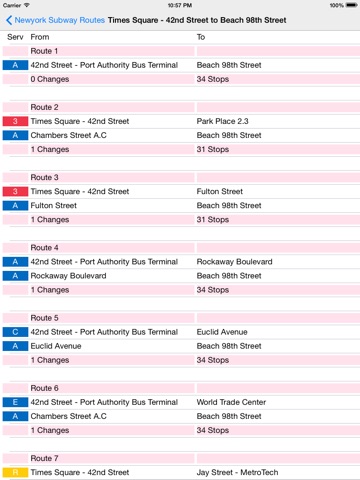 The search provides you with a list of alternative routes which can be used to travel from the source to destination stations in New York. It provides you with the number of service changes and station stops involved in each route.