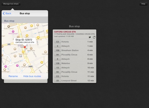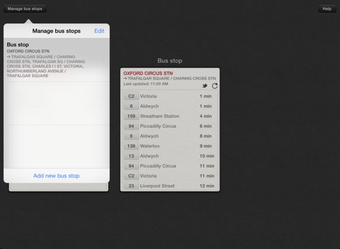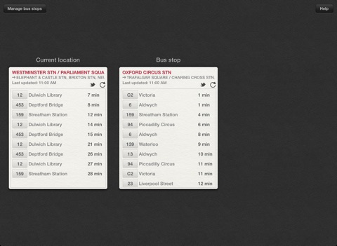 Next Bus Arrivals London has access to Transport for London live data containing real-time information about bus arrivals at all bus stops in London.