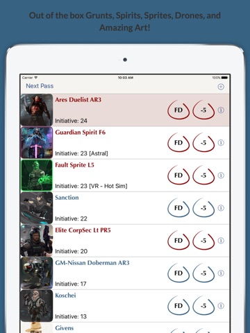 Includes buttons on the main screen to quickly apply interrupt actions such as Full Defense, Pre-Emptive Actions, and Interrupt Actions, the ability to add multiple copies of those pesky grunt NPCs with one tap, over two dozen character portraits, the ability to take or use photos as a character portrait, and, most importantly, a streamlined design that will let you focus on playing rather than tedious game mechanics.