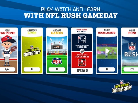 Experience Gameday Together! NFL RUSH Gameday is designed for kids to play fun games, customize their own avatars, watch awesome videos, and unlock cool digital gear from their favorite teams! Kids can play as they watch real NFL games, and complete a series of challenges based on passing, running and kicking the football.