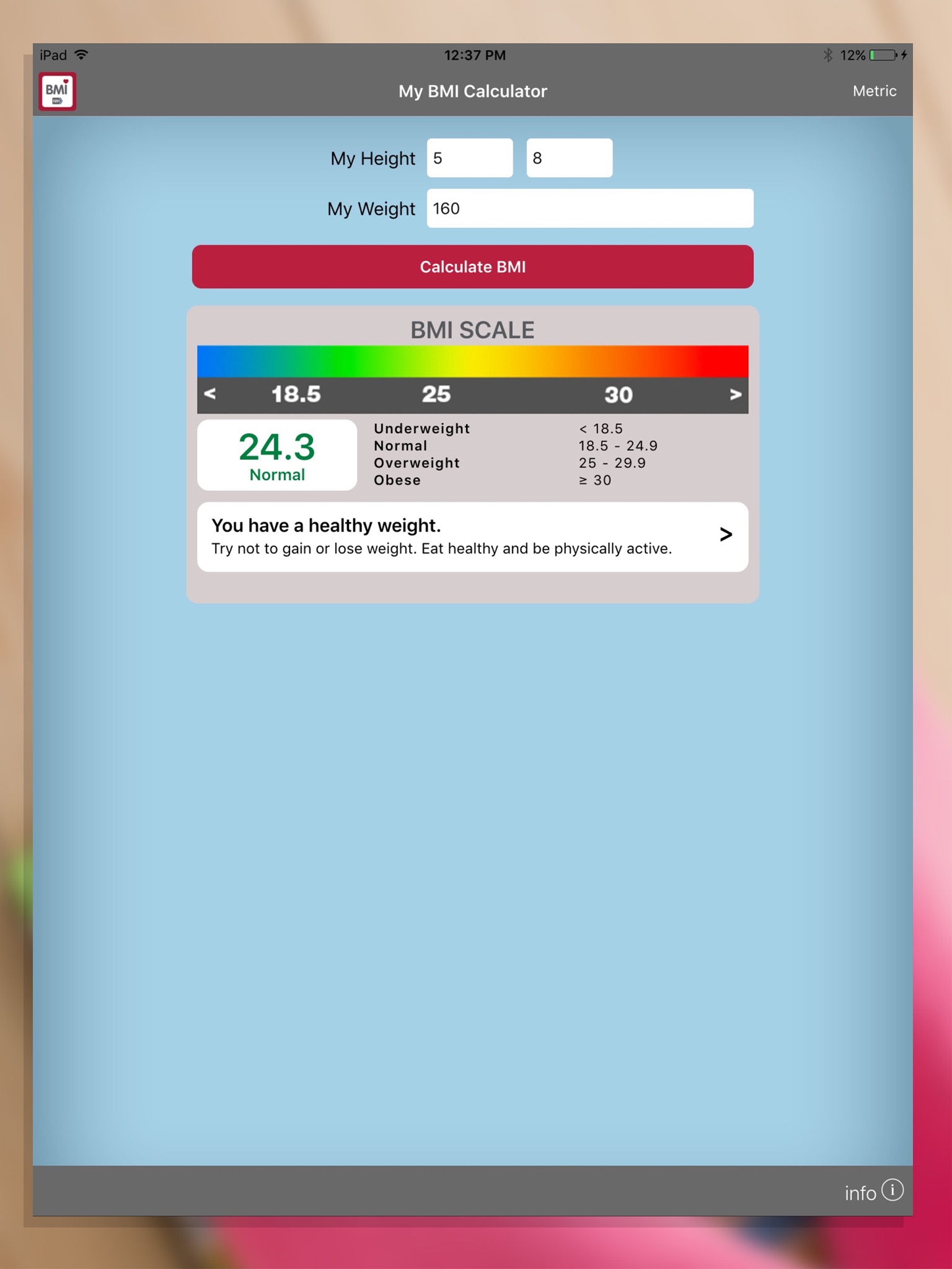 Uses correct BMI ranges (unlike OTHER calculators). Also, it seems some people do not understand that BMI does not measure body fat/muscle, so if it says youre obese but you know youre not, thats why.