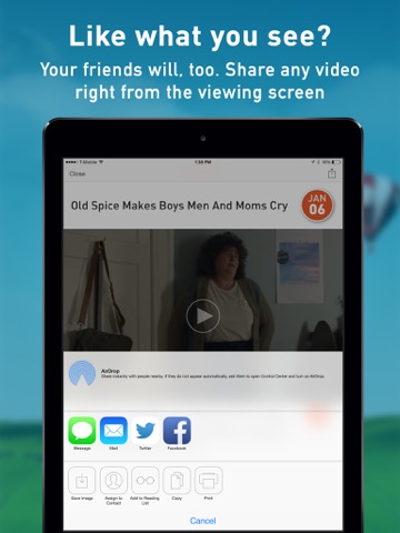 Open the app, and you’ll be greeted with our latest find. Just press play and see what you’ve been missing on the World Wide Web. Once you’ve seen our latest nugget of Internet gold, you can share the treasure with your (social) networks right from the same screen.