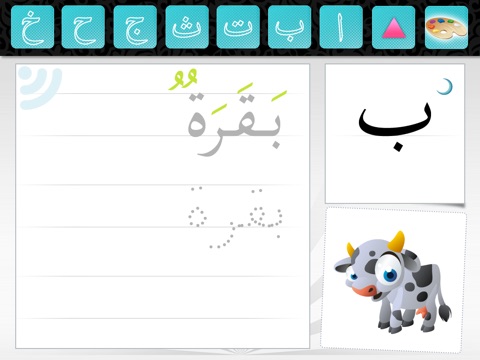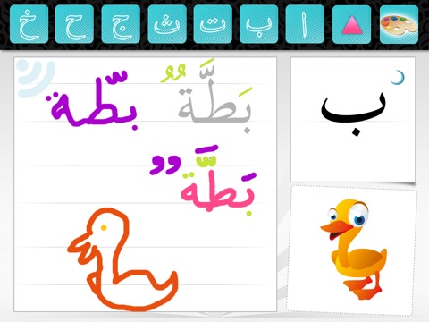 This HD application, fruit of the development of a passion for the Arabic language, proposes a real enriched Alphabet primer every letter of the alphabet of which is illustrated by words and images of animals. The calligraphy of the name of the animal is shown as well as the animation of the writing of the 1st letter and its pronunciation. Every illustration can be touched to listen to the name of the animal and for certain letters, see another animal for the same letter In the space reserved for the calligraphy, the child will can: