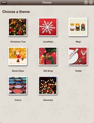 Personalize your Christmas albums and calendars over 35 themes to choose from, organized in 8 categories: Christmas Tree, Snowflake, Kings, Santa Claus, gift wrapping paper, textiles, colors and geometry.