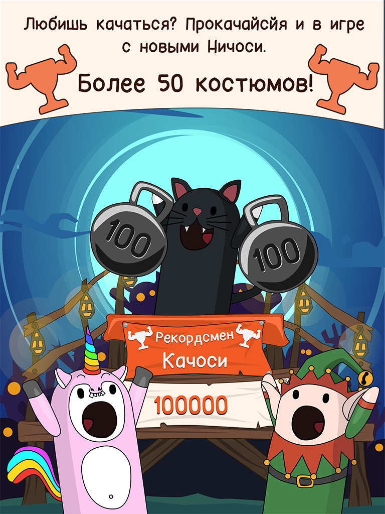 И помни: мы за честный спорт! Прокачивание качоси полностью за тобой! Есть Качоси, которые используют стероиды! Натуральный бодибилдинг против химического! В таблицу лидеров попадают только те Качоси, которые качаются при помощи тапов, остальные с позором оттуда удаляются! Ничоси! Обмануть тренера не удастся =)