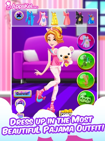 Sleepover Party is a dress up game for girls. It lets you put all your fashion creative thinking to practice and design a sleeping attire for your girl. You can then post your creation on social media (Facebook or Instagram) and send it via email, so your friends can be awed by your creative thinking.